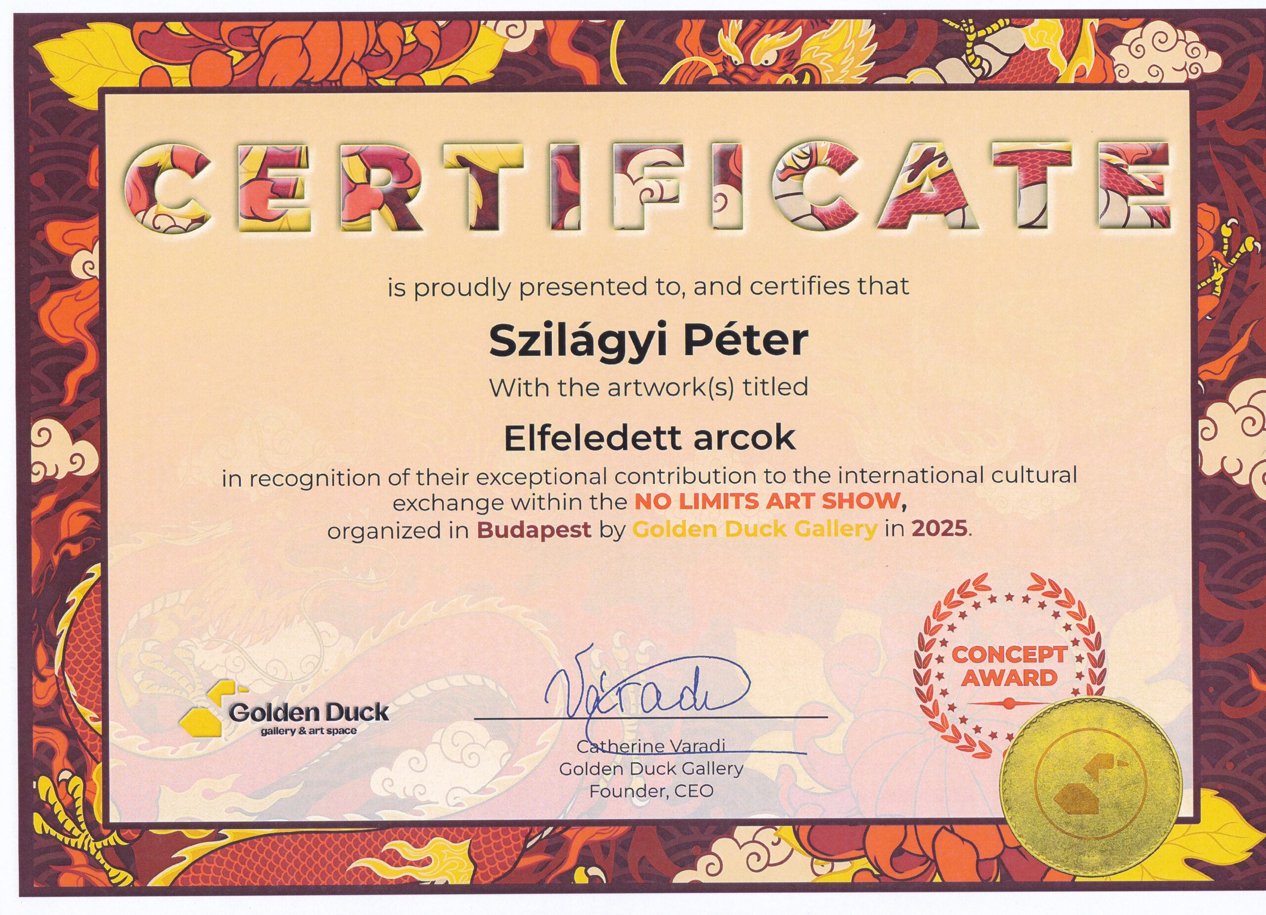 Október 3-án nyílt meg a Golden Duck Galériában a No Limits 2025 kiállítás, ahol három monokróm festményemet is kiállították. Az Elfeledett arcok c. festményem Concept Award különdíjat nyert.