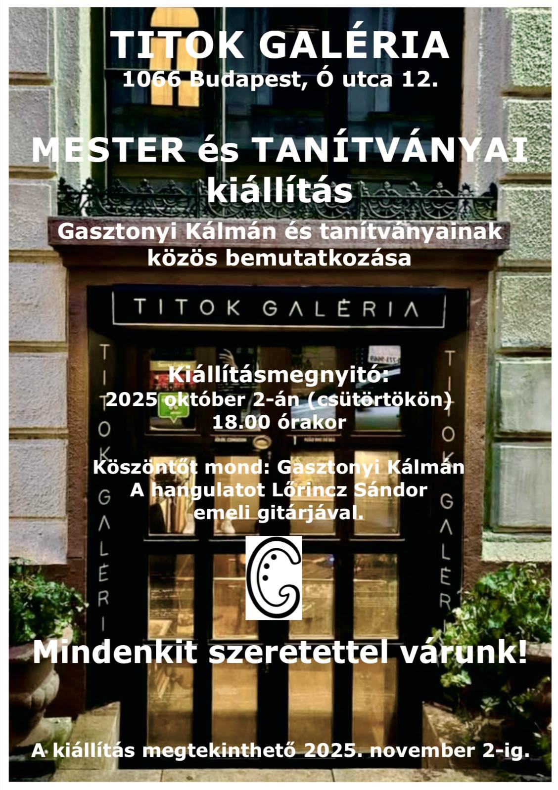 Gasztonyi Kálmán és tanítványainak kiállítása nyílt meg 2025. október 2-án a Titok Galériában (1066 Budapest, Ó utca 12.), ahol 2 festményem látrható. A nyüzsgő, barát hangulatú megnyitón a mesteren kívül sok kedves festőtársam és barátaink, családtagjaink vettek részt.